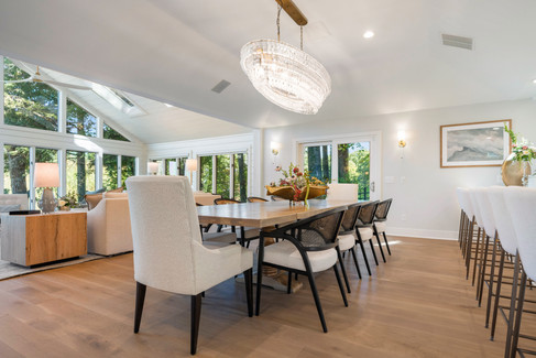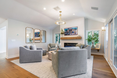 Moving into the living area you’ll see a classic straight Venitian plaster fireplace in a cream color with a sleek designed stained wood mantle to match the flooring. We updated the walls with fresh paint in Sherwin Williams Fleur Del Sel, updated recessed lighting with retrofit LEDs and dimmers, updated sconces, and added a chandelier. Two French doors will lead outside to the patio with a collar remote doggy door. We also added an Arhaus chandelier above the dining room table.