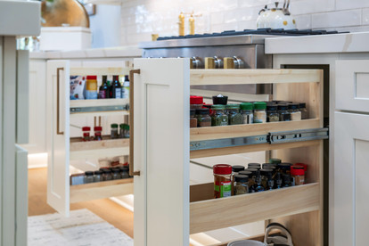 Right off the kitchen is the connecting pantry and laundry room. The pantry room features an abundance of storage space with Fabuwood shaker cabinetry in the color Timber and two utility cabinets for trash & recycling and a built-in ice machine. On the right wall, you will notice the same Anthology Cotto Bianco tile backsplash and two custom wood floating shelves to match the flooring with two satin brass sconces above.