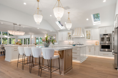 When walking up the stairs, you will then enter the massive and gorgeous kitchen. Double island, say what?! The two islands feature Dwyer Marble & Stone ENVI Calacatta Sol mitered edge countertops with Fabuwood shaker cabinets in the color Timber for the first island and the second island is Arbor Lane cabinets in the color Snowdrift with Alexander satin brass hardware Emtek, and toe kick lighting. The farmhouse apron sink style is from Karran. We updated recessed lighting with retrofit LEDs and dimmers, as well as adding three new Jacqueline chandeliers above the islands, our favorite!