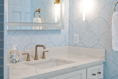 Bathroom two was updated with all new flooring, new Arbor Lane cabinets in Snowdrift with satin brass hardware Carmen, ENVI Calcatta Sol countertops, a new Karran sink, locally sourced wallpaper, and a brand new renovated shower with Anthology Celestial Tile from the Seasons Collection and a custom-lit shower niche. Niches are great for extra storage space.
